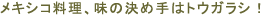その本場、メキシコでは、料理の味付けに欠かせないもので、トウガラシの種類もたくさんあります。日本料理に例えると、醤油や味噌、鰹節や昆布のようなものでしょうか?トウガラシといってもメキシコでは形や色、大きさ、風味などさまざまです。激辛のものもあれば、ほとんど辛味の無いものもあります。