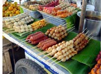 タイで楽しみの一つと言えば、やはり屋台の食事でしょ。朝、昼、夕といつでも手軽に早く、安く、そして美味しく食事ができるのが魅力です。バンコクをはじめとして、都会では巨大ビルが建ち並び、また建設中のものも多く見受けられます。それに合わせて労働者達が増え、その労働者達を目当てに街路に数多くの屋台が建ち並んでいます。サラリーマンも労働者も時間のない朝にはお粥を掻き込んだり、お昼になって少し時間に余裕ができれば、好みのクイッティャオ(ビーフン)を注文してその場のテーブルで食べたり、タイ独特のテイクアウトの仕方、何でもかんでもビニール袋に詰め込み、それを持ち帰る人々の姿があります。また仕事を終えた後、友人や家族と一緒に屋台街に来て、昼間の慌ただしさを忘れるかのように楽しそうに食事をする人々の姿もあります。このように屋台の料理は、タイの食文化の一部を形成するまでに発展したと言えるでしょう。 |