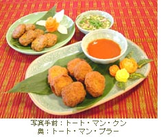 | さて今回の料理ですが、屋台で最も人気のある料理の一つ「トート・マン」を作りましょう。いったい何の事だろうと思われる方が大半でしょうね。タイ語で「トート」は「揚げる」、「マン」は「油脂」の事を指します。ですから「トート・マン」で「油で揚げた物」と言うことになります。実際には主材料に魚かエビを使うことが多く、魚の場合は「トート・マン・プラー」で「タイ風さつま揚げ」、エビの場合は「トート・マン・クン」で「タイ風エビのさつま揚げ」ということです。 |