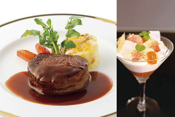「牛フィレ肉のステーキ」「柑橘のヨーグルトムース」