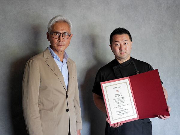 「この度は非常に輝かしい賞をいただき心より光栄に感じ嬉しく思います。修業時代には、中国料理の壮大さ、奥深さ、技術力の高さを教わり、日本料理からも日本の豊かさ、日本人の精神性を学んできました。技術というものは僕自身が一人で表現しているのではなく、先人の想いや苦労やいろんなものがあって今に受け継がれている、そのことに感謝したいですし、自分も未来につないでいきたいと考えています。自分自身、若き日から料理という道を志してきて、いろんな方から教えをいただき、辻静雄先生の本からもたくさん学ばせていただきました。日本人として異文化を勉強していく者の心構えや、日本の食材を理解せずして日本における何かを成就したことにならないという解釈に至れたのはとても大きかったと思っています。今回の受賞はもっと料理に向き合って精進しなさいというメッセージをいただいたと受け止めています。この度は素晴らしい賞をいただき、素晴らしい刺激をいただき、誠にありがとうございました。」