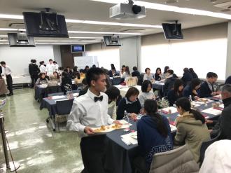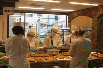「辻調グループフェスティバル」では、『平成最後のtsuji ~新しい食の時代の幕開けへ~』をテーマに、クラスごとに様々に飾り付けした店舗でお客様をお迎えし、料理やお菓子を最高のクオリティで提供しました。お客様にはガラス越しに調理する姿を見ていただいたり、製造したお菓子やパンを展示するなど目でも楽しんでいただけるよう工夫していました。毎年楽しみにしてくださる近隣の方々は開場前から列をなし、2日間で延べ3万人が来校され、学生たちも楽しんでおもてなしをしていました。