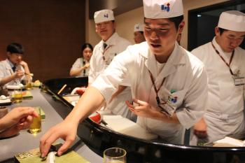 彗田大学校はホテル調理外食学部日本料理専攻のクラスを持つ2年制の大学で、韓国ではレベルも人気も非常に高い学校です。4年目となる今回の研修では、出汁についての講習授業、1人1匹鯛を捌き、平造り、そぎ造り、鯛ご飯の調理実習、市場や酒蔵の見学、実習最終日には寿司屋のカウンターを想定して、学生が「つくる」「接客する」「あじわう」の役割に分かれたシミュレーション形式の授業を行いました。研修最終日には修了式が執り行われ、学生には「修了証」と書籍『素材の力を引き出す 包丁の使い方』(ナツメ社)が贈呈されました。