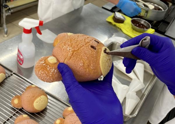 附属天王寺小学校の校長先生らにプレゼンテーションを行い、実際に試食をしていただいて選ばれたのが「くまメロンパン」です。パンが決定してからは、さらに試作を繰り返し、レシピを微調整しながら衛生検査を行うなど、様々な工程を経験することができました。そして迎えた提供日当日は、学生が自ら設計した作業工程に沿って、朝から220個のパンを焼き、1つ1つ顔を描いて製品を仕上げ、無事に「くまメロンパン」を届けることができました。