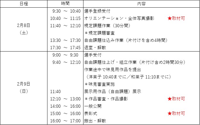 会場となる辻調理師専門学校からは、洋菓子部門2名、和菓子部門2名の学生が出場し、学びの成果を発揮するべく、日々練習を重ねてまいりました。報道関係者の皆様におかれましては、お忙しい中とは存じますが、ぜひとも全国から集まる学生たちの勇姿を見届けていただき、ご取材等賜りますよう宜しくお願い申し上げます。