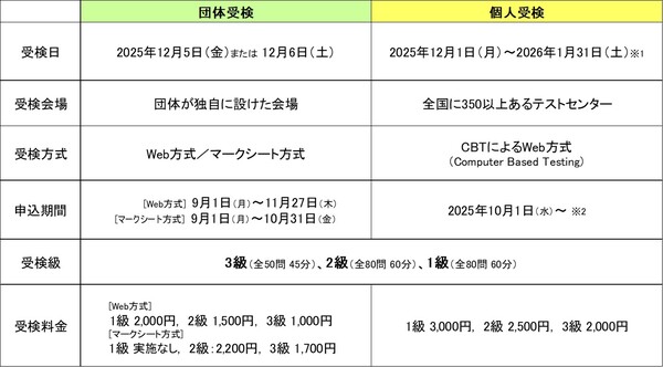 【冬期受検の申込み】団体受検9/1~、個人受検10/1~受付開始