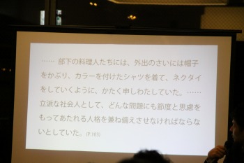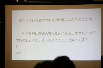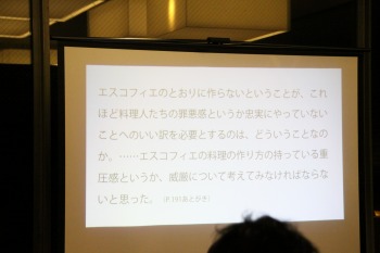 料理人の育成方法の日本とフランスの違いにふれ、日本の徒弟制度に対して、フランスでは数年で店を移っていく傾向がある。料理教育に対するあるべき姿をエスコフィエにみいだした辻静雄のその思いが、この本に出ていると話しました。