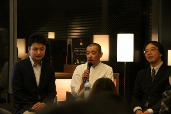 現在、「月刊専門料理」で「エスコフィエを読む」という連載を担当されているレストラン「サラマンジェ」のオーナーシェフの脇坂尚さんと、その「月刊専門料理」の編集長・淀野晃一さん、さらに辻静雄が改訂版を出す際に編集を担当した「辻静雄料理教育研究所」の研究顧問の山内秀文さん、三人でのトークショーとなりました。