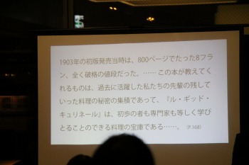 「『ル・ギッド・キュリネール』の序文に、今は初心者でも20年後にわれわれの業界のリーダーとなるべき人に読んでもらいたい本だとしています。本棚にかざっておくべき本ではないのです。当時8フラン、今のお金にすると、3,000円しないくらいです。1900年当時のお金に換算しても日当が5フラン、パンが1キロ3フランくらいですから、10,000円位になりますが、いずれにしても、どうしても手が出ないほどの高い本ではありません。新訳もできるだけ、安い設定で出版にこぎつけたい。」と、その思いを語りました。