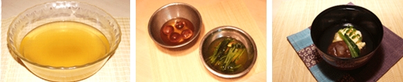 吸地八方とは材料に味をつけるためのだし汁、椀づまとは椀物の副材料で主に季節の野菜を使います。