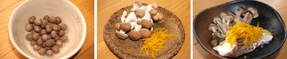魚を干している間に、あしらいの準備です。今回使うのはむかごにしめじ。