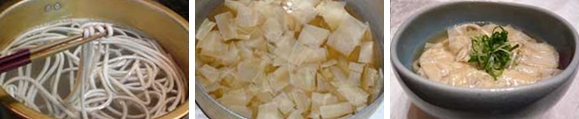 このまま器に盛るのではなく、湯葉の入ったかけだしに移し、一度軽く混ぜます。器にうどんを入れてかけだしを注ぐと、とろみがついているために、かけだしが器の底まで回らないからです。器に盛って、好みで葱と山葵をかけていただきます。