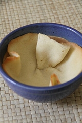 で基本を叩き込まれた私にとってはかんたーん!だったのだが、あれ! 生地を流すための薄い型がない! 厚紙でも結構ですよ、と先生は涼しくおっしゃっていたが、1.5ミリの厚さで水を弾く紙質の厚紙、なんて普通の家庭にはなかなかあるものではありませんっ。幸い、数日前に日本の知人からお土産にいたいた北海道銘菓「白い恋人」(懐かしい~)の箱が、厚みなどなかなかいい感じ。さっそく丸く切り抜いてみたのだが、直径が微妙に足りない。でも何とかそれを利用して、天板の上に薄く、丸く生地を伸ばすことに成功。が、難関はいつもの通り、我が家のオーブンである。テキスト通り180度で7~8分焼いていたら、あれよあれよという間に焼けすぎてしまった。焼き色は濃すぎる上に、天板からはがして型に敷いている間にカチカチ。型に敷き詰めようとしたとたん、パリン! 割れてしまった。きー、悔しい! しょうがない、生地をもう一度準備して再挑戦。私はいつも、こんな時、オーブン自体よりも我が家の天板の材質が悪い(熱を簡単に通しすぎる?)のではと睨んでいるので、今度は天板の下に何重にもアルミホイルを敷き、生地は天板に直置きではなくオーブンペーパーの上に流してみた。そしてオーブンに入れたらかなり早い時点で取り出す。早く、早く! 早くはがして型に入れないと硬くなっちゃうよ~と大焦りしながら型に敷き詰めると、今度は用意しておいた型が生地に対して若干大きすぎる。これじゃあチューリップ型にならないじゃないかっ!! 慌てて食器棚を開いた私の目の前に、ちょうどいいサイズと形のミニすり鉢が。これだ! と取り出して生地を中に入れ込む。ちょっとゆがんでしまったがなんとか器形にできあがった。でも焦っていたので、一部ゆがんで醜い仕上がり。直そうと思っても、すでに硬くなっているから後の祭りである。