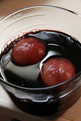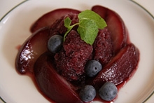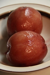もう一品、グラニテに挑戦。ブリックス計がここでも必要になるのだが、ここではそれを私の舌で代用することにしてとにかく作ってみることにする。桃の湯むきって始めてしたけれど、トマトと同じように皮がツルリとむけておもしろい。そしてこの桃を赤ワインで煮込んで、その煮汁を凍らせて、かと思いきや、その煮汁の中にラズベリーのピュレを混ぜて凍らせるという、ここでも贅沢