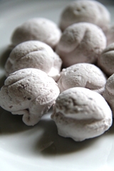 気を取り直して作ったパート・ド・ギモーブは、上々の出来。ぴたりとくる型がないので、やっぱり流し缶と、シリコンのミニボール型を使ってみた。生地の半分をフランボワーズ風味、半分に抹茶を入れてみた。どちらもとても美味しい仕上がり(ただしシリコン型には絞り袋を使って絞り入れたのだが、絞った跡が残っていまいちの外見)。マシュマロが自宅でできるの!と家族や友人にも大好評で、とても満足。終盤に向けて、ますますやる気が出てきた私であった。
