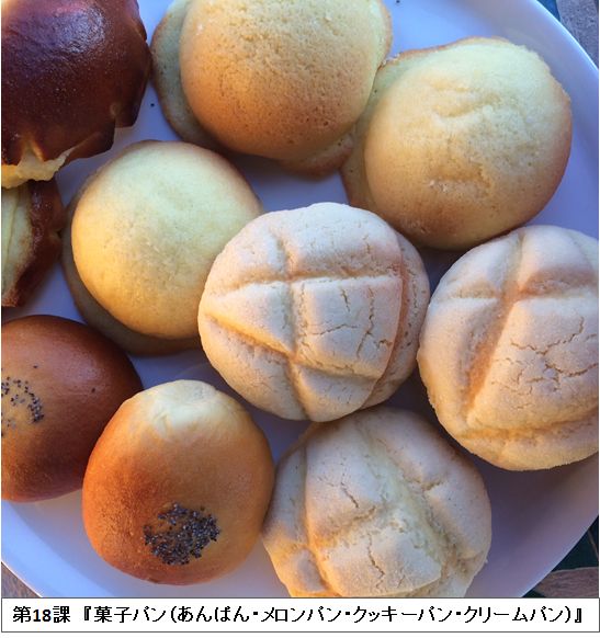 18課では中種法を使ってメロンパン、クッキーパン、クリームパン、あんパンを作る。