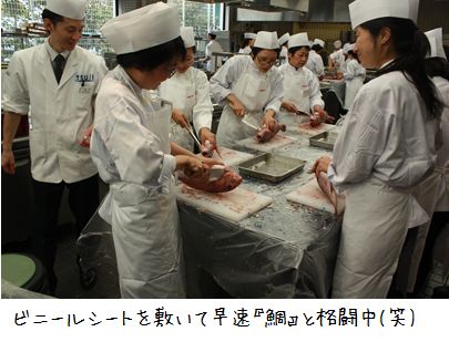鱗や血が飛び散るので、作業台の上にはビニールのシートがかけられ、皆さん中々悪戦苦闘・・・。