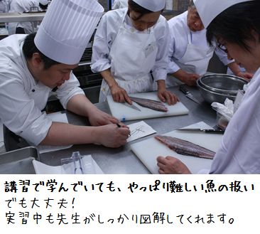 舌平目の処理や卸し方などのポイントは、講習で聞いて見ただけでは難しいですが、先生が図を書きながらしっかり説明してくれます。
