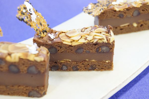 小豆の浮島生地で、チョコレート蜂蜜羊羹をサンドしています。