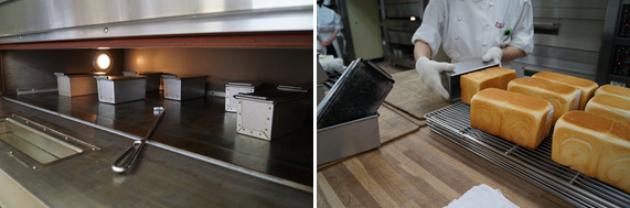 焼成後に、パンの側面が内側にくぼんでしまうケーブイン。これをを防ぐために、焼きあがったパンはすぐに型ごと机の上の落としてショックをあたえてから、素早く取り出します。