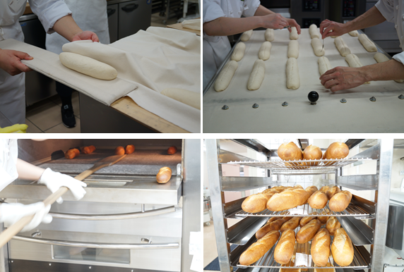 生地は取り板でスリップベルトに移し、クープを入れてオーブンへ。