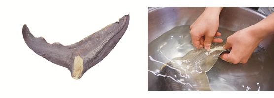 まるごとの原ビレを戻すには、お湯は熱過ぎず、ぬる過ぎず、ていねいな下処理を。