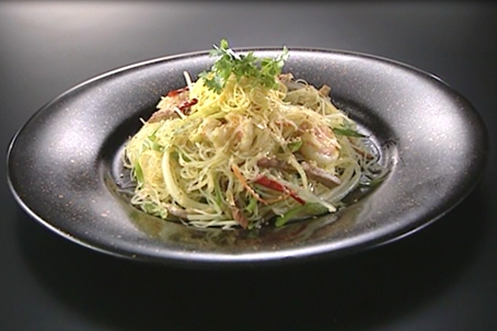 仕上げに煎りゴマ、卵の細切り、中国パセリをのせて。